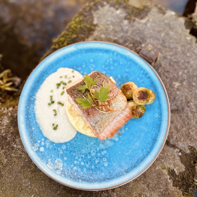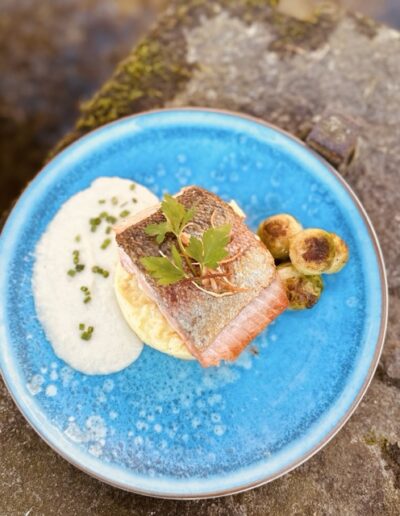 Regenbogenforelle, Austernpilzsauce.
