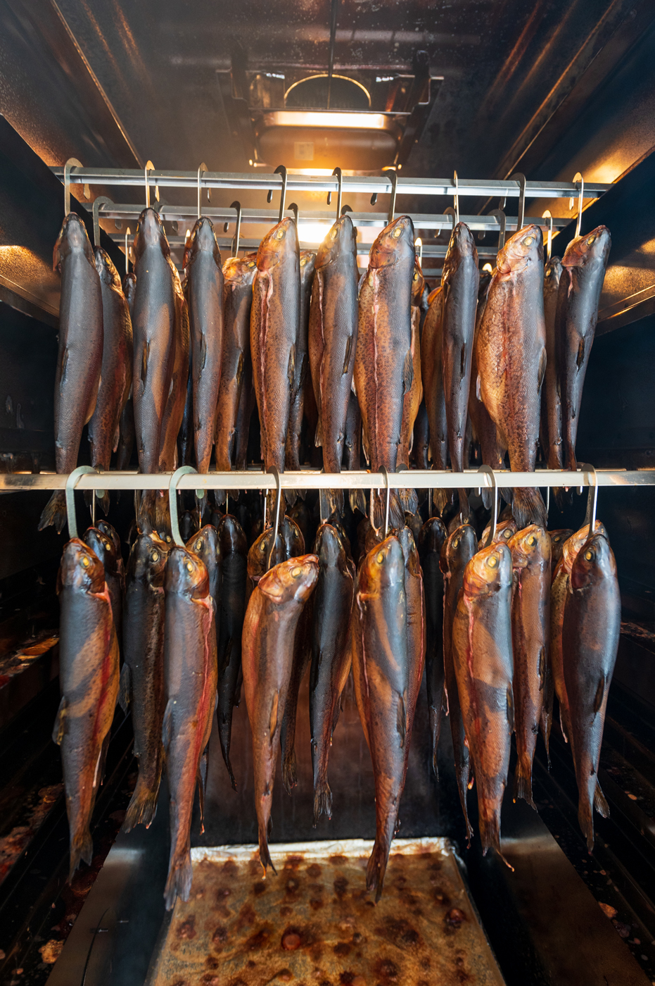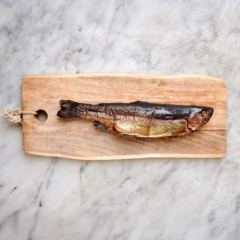 Regenbogen-Forelle als Ganzes 5 bis 6 Stunden geräuchert (je nach AuBentemperatur, Luftfeuchtigkeit, Wind…) bei einer Temperatur von 60 bis 70°c, mit einer Spitze über 80°c, mit Eichen-und Buchenspänen, für einen kräftigeren Geschmack, weil die Haut als Filter wirkt und nur den guten Geschmack des Rauches deurchläBt.Truite arc-en-ciel “portion” fumée entièrement durant 5 à 6 heures (suivant la température extérieure, l’humidité de l’air, le vent,…) à une température de 60 à 70 °c et un pique supérieur à 80°c.