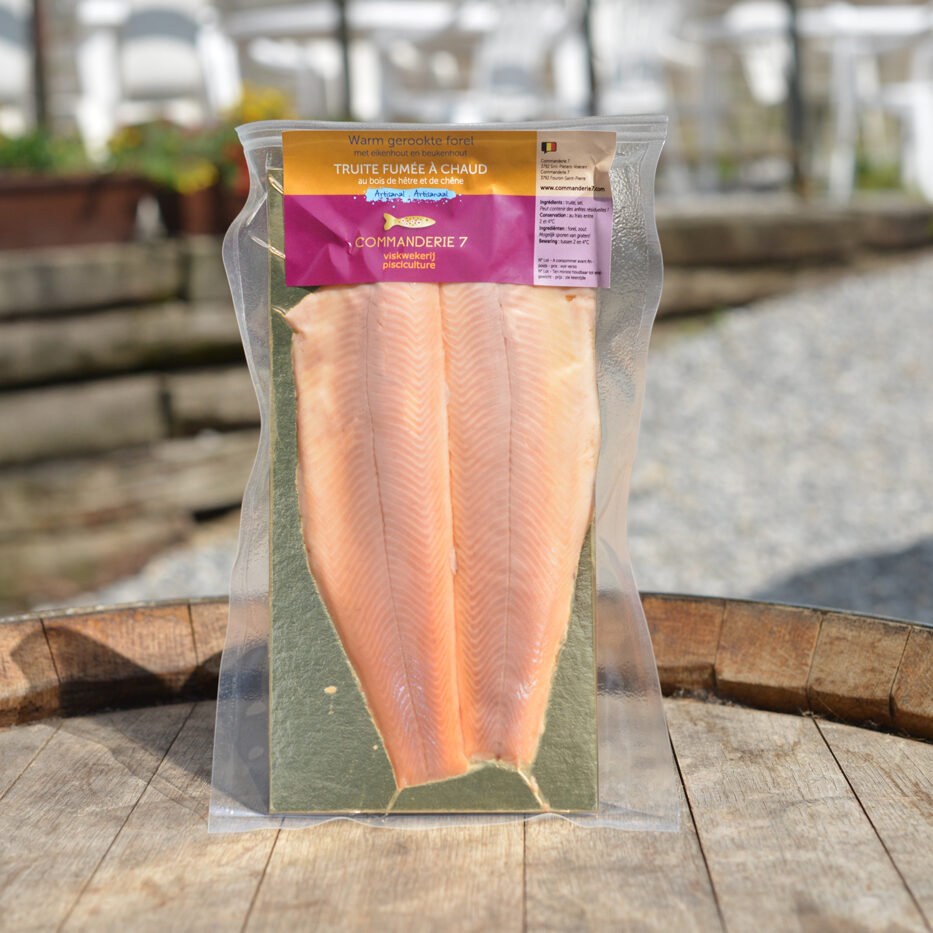 Regenbogen-Forelle als Ganzes 5 bis 6 Stunden geräuchert (je nach AuBentemperatur, Luftfeuchtigkeit, Wind…) bei einer Temperatur von 60 bis 70°c, mit einer Spitze über 80°c, mit Eichen-und Buchenspänen, für einen kräftigeren Geschmack, weil die Haut als Filter wirkt und nur den guten Geschmack des Rauches deurchläBt. Dann zum Filet verarbeitet und vakuum-v verpackt mit einer Halt-barkeit von 30 Tagen.