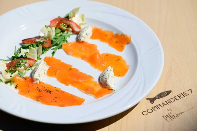 Crème fraîche battue avec notre miel Cybelle, de la moutarde à l’ancienne, du citron, sel et poivre.